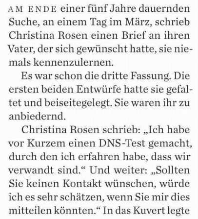 Ein weitere Klassiker, insbesondere bei Reportagen: Man erzählt zuerst das Ende. Auch wenn Fans von Romanen alle verteufeln würden, die ihnen den Ausgang ihres Bestsellers verraten, bevor sie ihn zu Ende gelesen haben, gilt das Prinzip des „Spoiler-Alerts” im Journalismus nur eingeschränkt. Hier erfahren wir (vgl. Bild) ganz am Anfang schon, dass die Frau ihren Vater am Ende gefunden hat. Na toll, da hat der doch schon am Anfang das Spannendste verraten, oder nicht? Nein: den Journalisten bei der GEO ging es um etwas völlig anderes in dem Beitrag. Kern der Geschichte ist nicht dass sie ihn, sondern wie die Tochter ihren Vater findet: nämlich mit den aktuellsten und neuesten Methoden der Genforschung, die im Zentrum der Reportage stehen. Dass das Ende also bereits am Anfang verraten wird, hat folgenden Grund: Beim Leser sollen sofort andere Fragen (z.B. wie? oder warum?) in den Fokus rücken und so sein Interesse am Artikel befeuern. Anders gesagt: Nur weil man bereits den Ausgang einer Geschichte kennt, heißt das nicht, dass man nicht wissen will, wie es dazu gekommen ist.
