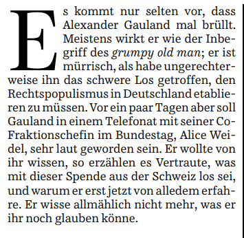 ARTIKEL ÜBER DIE SPENDENAFFÄRE VON ALICE WEIDEL: „GRÜEZI, UND AUF WIEDERSEHEN” AUS: SÜDDEUTSCHE ZEITUNG (19.11.2018)