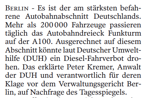 ARTIKEL ÜBER DROHENDE FAHRVERBOTE: „AUF BERLINS AUTOBAHNEN DROHEN FAHRVERBOTE” AUS: TAGESSPIEGEL (17.11.2018)