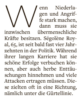 ARTIKEL ÜBER DIE FRANZÖSISCHE POLITIKERIN SÉGOLÈNE ROYAL: „REVUETÄNZERIN,SCHNEPFE, KUH” AUS: WELT (17.11.2018)