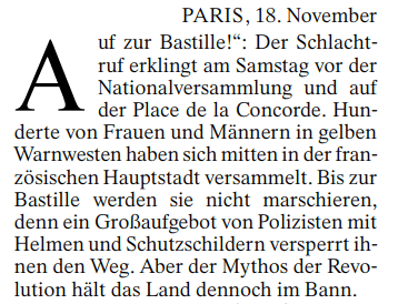 ARTIKEL ÜBER DIE „GILETS JAUNES” IN FRANKREICH: „MAJESTÄT, DAS VOLK IST UNBERECHENBAR” AUS: FRANKFURTER ALLGEMEINE (19.11.2018)