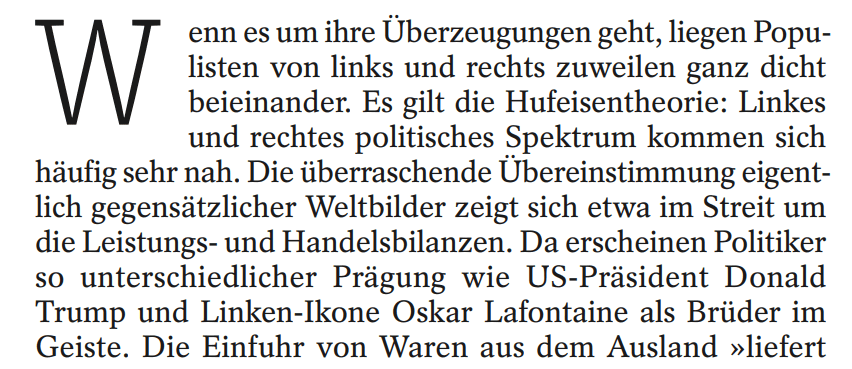 Verständlich, dass so etwas bei den Lesern zieht. Jahrelang dachte man genau zu wissen, wo die Grenzen zwischen linker und rechter Politik verlaufen und plötzlich das: Die Gegensätze sind weg, behauptet zumindest der Autor. Im Grunde ist diese Art von Einstieg ein Spiel mit den vermeintlichen Gewissheiten des Lesers. Das was ich zu wissen glaubte, wird auf einmal in Frage gestellt: Das muss mich dann logischerweise auch interessieren, wenn Schwarz und Weiß auf einmal nicht mehr Schwarz und Weiß sein sollen. Wichtig bei dieser Art von Einstieg: Als Autor sollte man die Entlarvung eines vermeintlichen Gegensatzes (oder einer vermeintlichen Gewissheit) immer gut begründen können. Echte Gegensätze lösen sich schließlich nicht einfach so in Luft auf, nur für eine gute Einleitung erst Recht nicht.