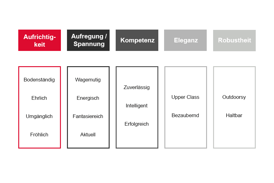 Nach diesem Modell lässt sich die Persönlichkeit von Marken in fünf Kerndimensionen einteilen: Aufrichtigkeit, Aufregung/Spannung, Kompetenz, Eleganz und Robustheit. Sämtliche Adjektive, die zur Beschreibung einer Marke geeignet sind, lassen sich einer dieser fünf Kerndimensionen zuordnen. Sammeln Unternehmen alle Adjektive, über die sie ihre Marke definieren wollen und weisen diese den jeweiligen Kerndimensionen zu, bekommen sie bereits einen Eindruck davon, welche Eigenschaften die Marke aufweist.