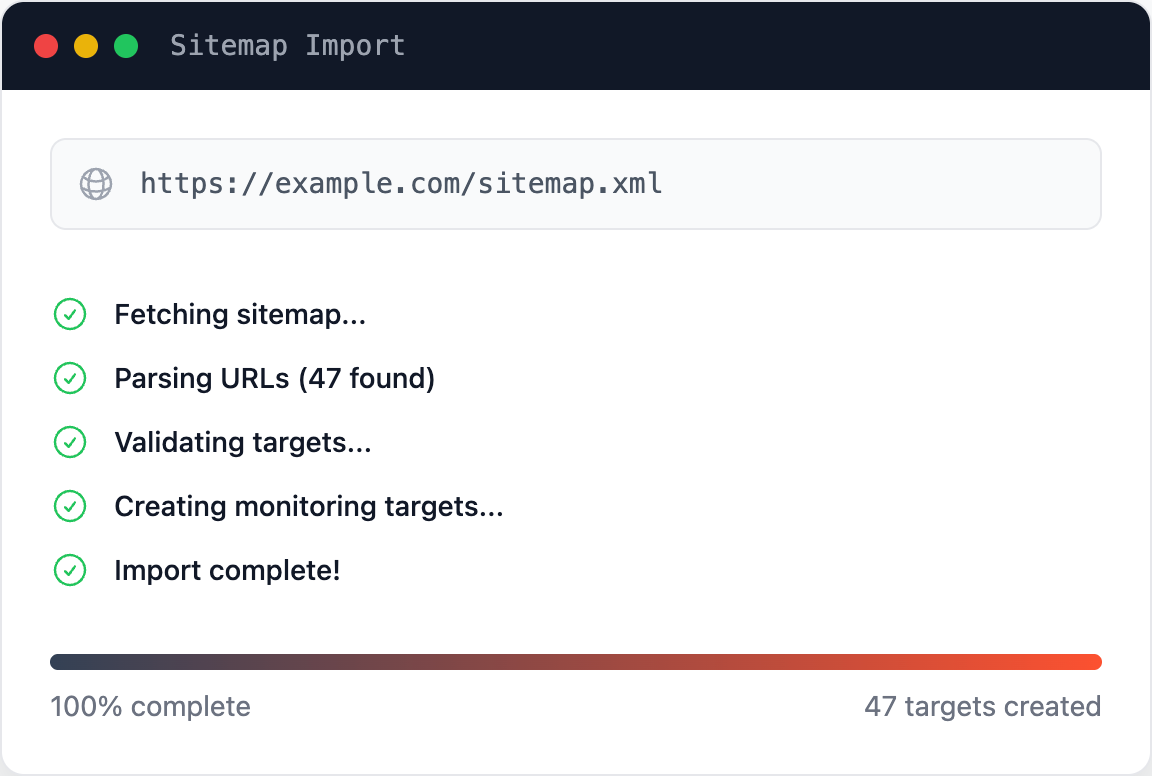 - Sitemap-Intelligence & Bulk Import: Du musst nicht jede URL einzeln anlegen. Kopiere einfach deine Sitemap-URL und Viewcel importiert und überwacht hunderte Seiten in Sekunden. So behältst du die Gesundheit deiner gesamten Domain im Blick.
