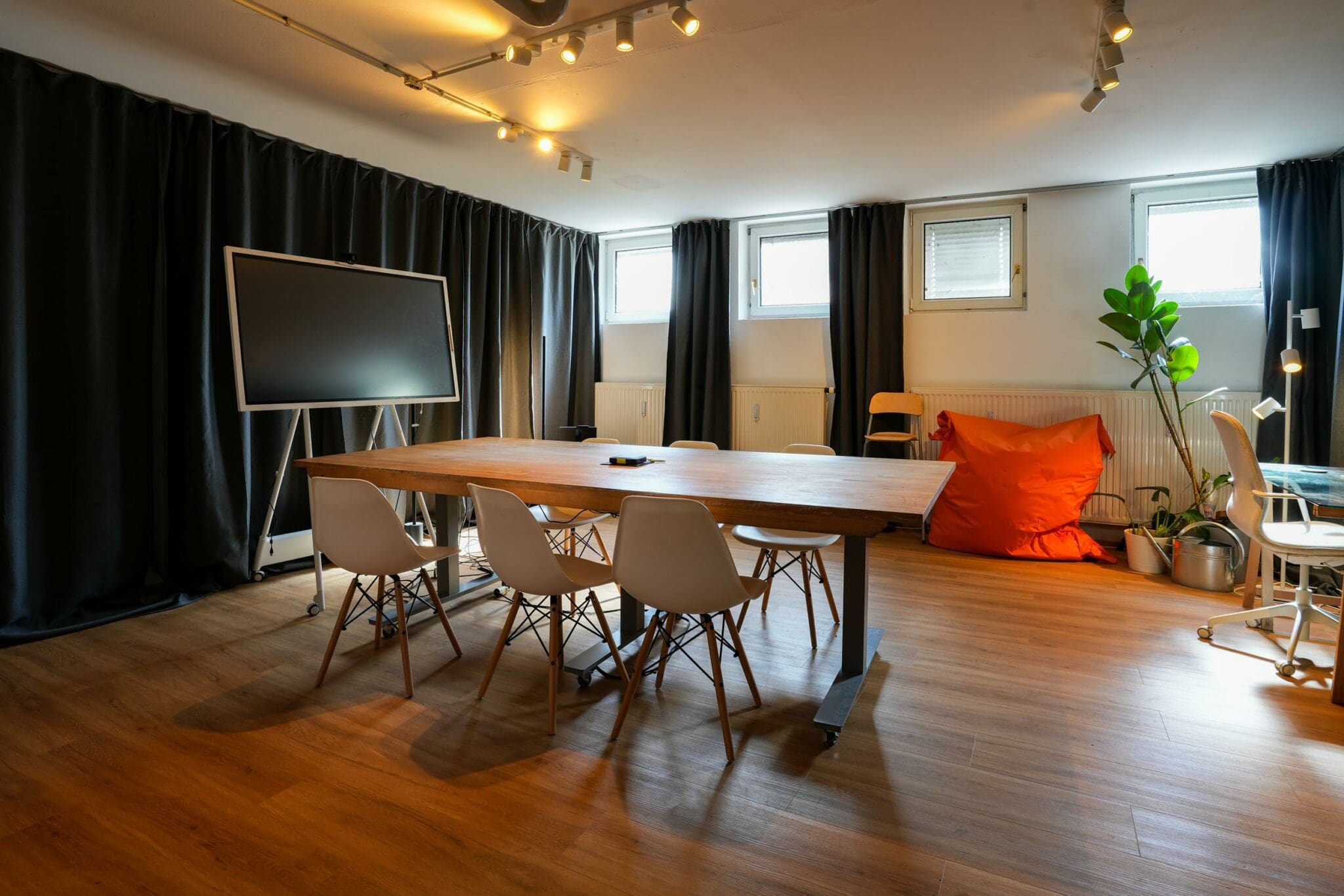 The Medienstürmer studio is approximately 80 square meters, features east-facing windows on the ground floor, and can be fully blacked out. It is available 24/7 and offers a bathroom and kitchen.